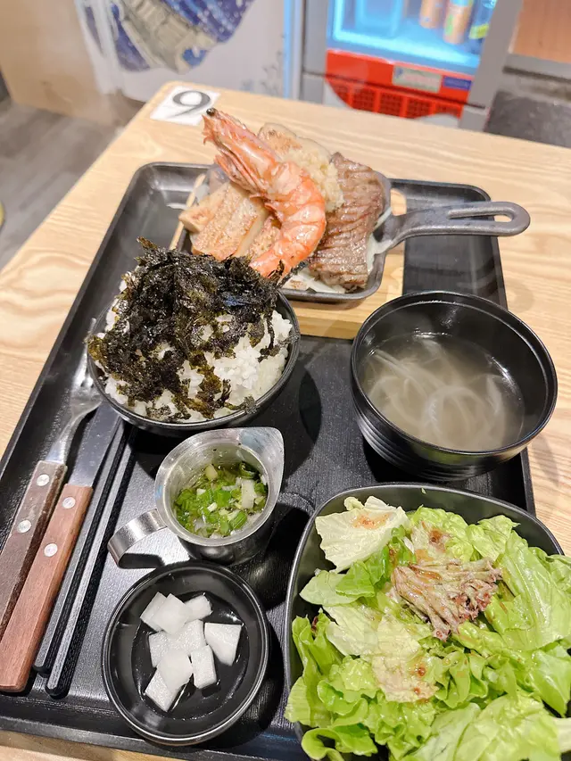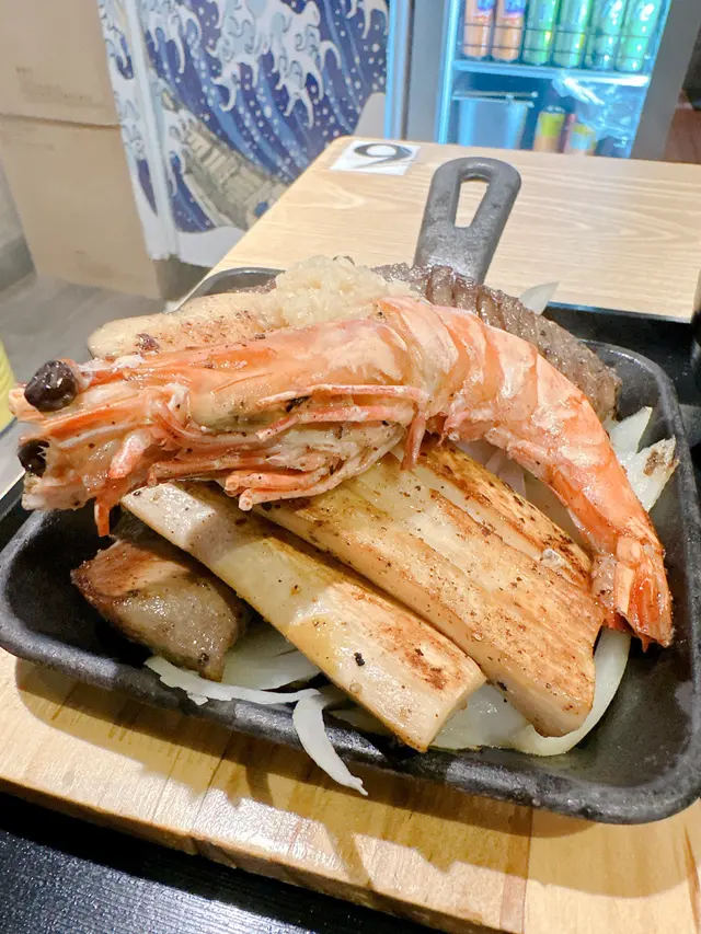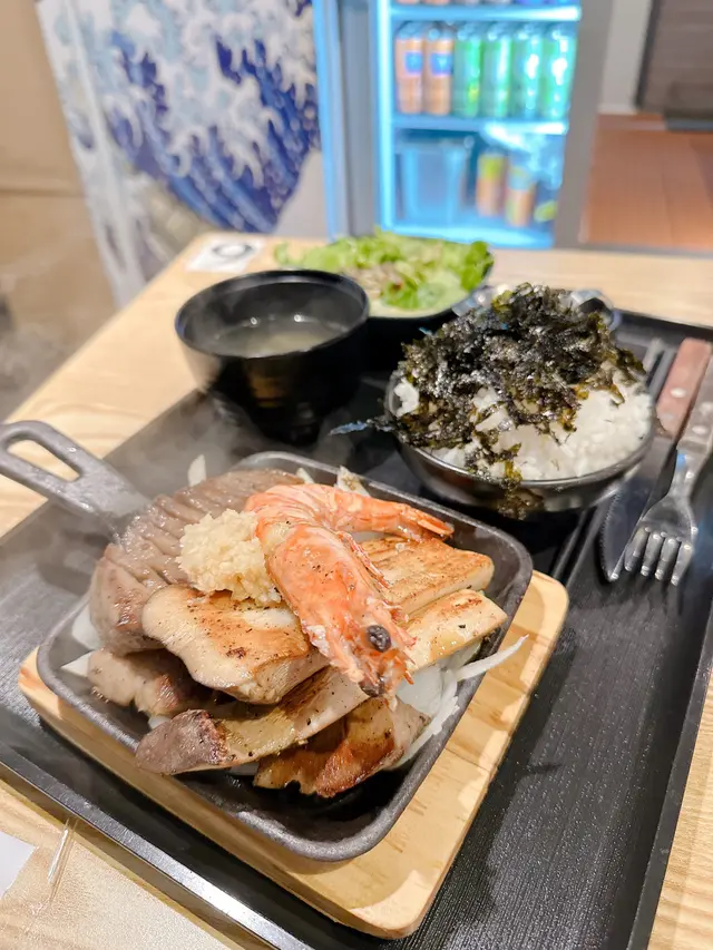 去觀塘工廈shopping 完發現有間以牛舌為主題的小店就入去試吓,dinner 有鐵板系列同丼飯套餐,我今次試咗鐵板系列同加咗套餐升級,味道真係唔錯有驚喜,估唔到工廈都食到好嘢。鐵板系列有以下二選一:1️⃣+$10 加配紫菜飯2️⃣+$28套餐升級 (包含:沙律,餐湯,紫菜飯,漬物,飲品)🔹可另加$5升級紅酒汁燴飯🔹追加:司華力腸(1條)$12牛舌芯拼香鮑菇拼大虎蝦 $128沙律菜新鮮配咗黑醋汁,白蘿蔔漬物醃得爽口同酸酸地,餐湯比較淡口,主角牛舌芯用迷你鐵板奉上,底部有洋蔥🧅,洋蔥吸收了醬汁很惹味同香,厚厚的牛舌尖烤得剛剛好,又juicy好彈牙,杏鮑菇大大片, 烤得脆嫩又多汁,大虎蝦爽甜好好味,配埋薑蔥醬汁撈飯真係好正😊。查看更多