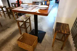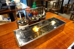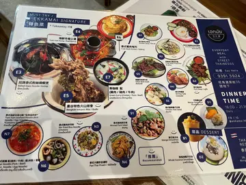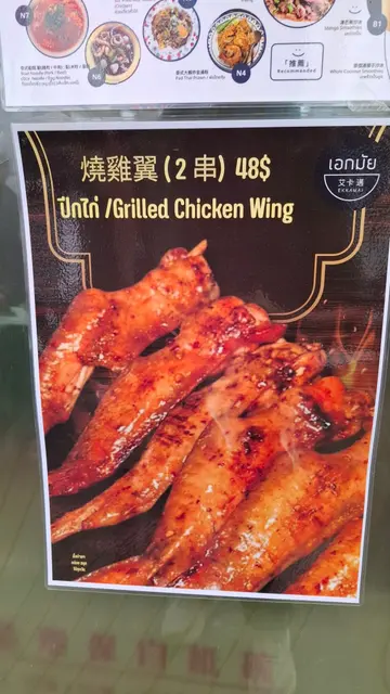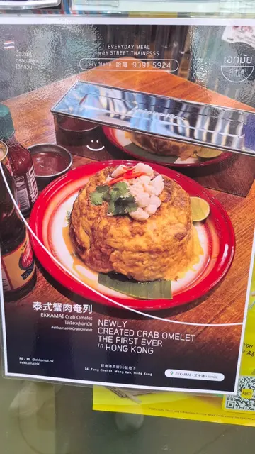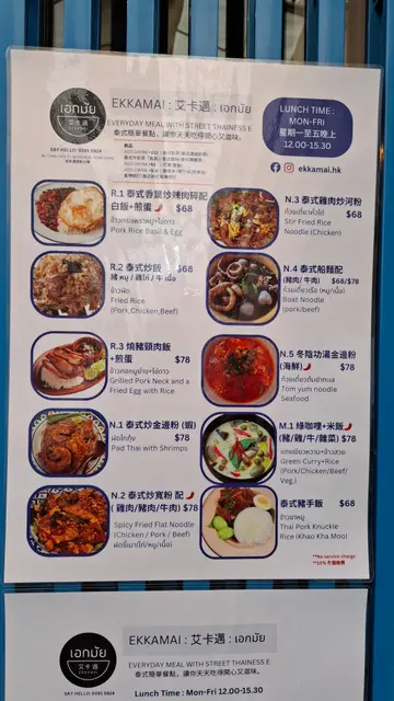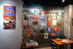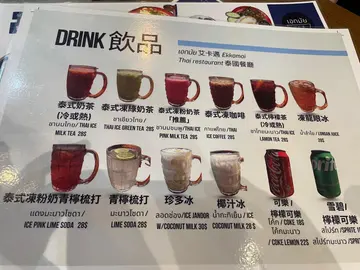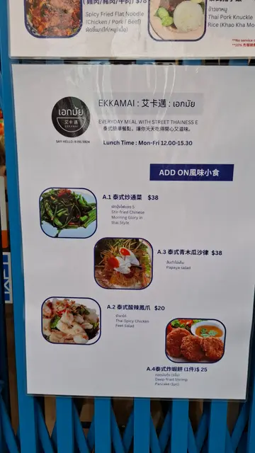 ,又晌唔同大酒店做過,自然多份興趣想試。走進餐廳,睇得出一派泰國街頭大排檔風,環境乾淨企理,牆上貼滿泰文海報、商品招紙……等等,氣氛輕鬆。而啲餐具、上菜用嘅碟……等等,同樣好街頭!由於餐櫈喺啲方形木櫈,唔方便擺袋、擺背囊,所以,每枱下面都有個竹籃,俾客人擺嘢。枱上放咗好些調味料,當然地道嘅泰國醬料就更加唔少得,而餐具放晌鐵盒之內,感覺會衛生好多。餐牌就一大張A3印晒所有菜式,仲有一張喺推介,另一張喺其他飲品,中英泰文,亦有晒「冧把」,最正喺無加一嘛
