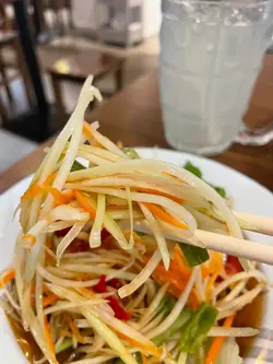 除泰國青木瓜,仲有甘筍絲、車厘茄同有啲生菜墊底,青木瓜絲、甘筍絲口感爽脆,醬汁酸酸辣辣,頗為開胃,不過,辣度幾勁吓,至於魚晌邊度?細問之下原來喺醬汁加咗啲發酵過嘅魚嚟做,帶微微鹹香味。