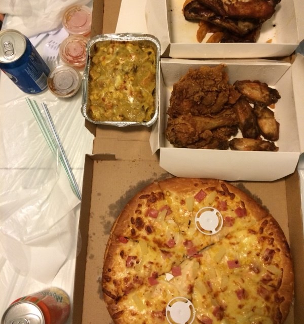 $133 有D咩食呢? 1個環球世界大薄批~ 香辣海鮮焗飯~ 2件炸雞~ 2罐百事~~環球世界大薄批 - 即係PixxxHux既至尊批咁~ 咩都有~ 個批好求其咁切左幾下就算~ 完全分唔開~ 要用刀再鋸先可以將佢地分開~ 味道可以~ 用料足~ ~香辣海鮮焗飯 - 食完pizza同炸雞已經食唔落~ 留待明晚dinner~