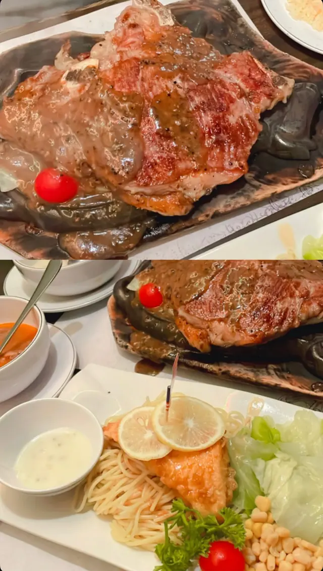 🟢巨型T骨牛扒這道牛扒份量十足,肉質鮮嫩,搭配黑椒醬汁,讓牛肉的風味更加突出,配菜也很新鮮。🟢白汁龍脷柳意粉龍脷柳肉質滑嫩,白汁濃郁,意粉煮得恰到好處,吸收了醬汁的香氣。整道菜口感柔和,適合喜愛吃魚和奶香的人士。套餐還有附送湯和餐包和飲品🟢羅宋湯/忌廉湯羅宋湯:湯品酸甜適中,蔬菜新鮮,味道清爽,開胃效果佳。 忌廉湯:濃郁順滑,奶香味十足🟢餐包 餐包外脆內軟