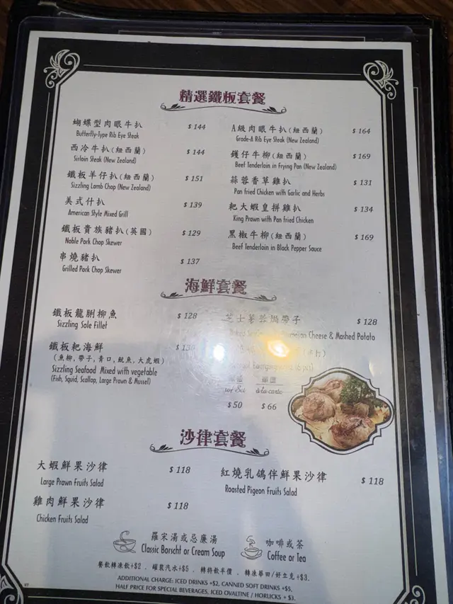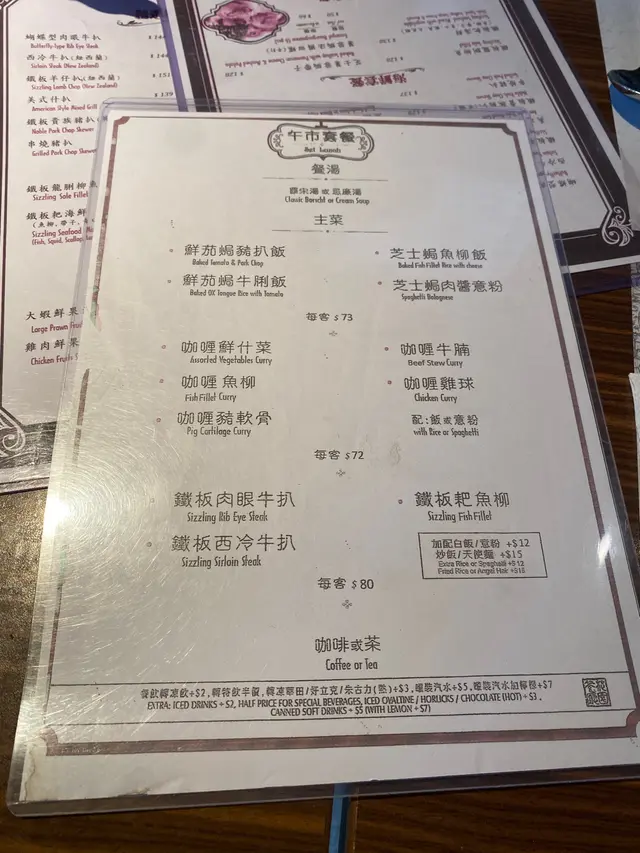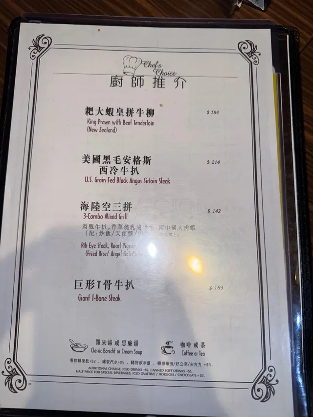 品牌由1963年創立至今,是經典的港式扒房之一,定價親民。主打不同部位的牛扒,另有供應其他西式料理。