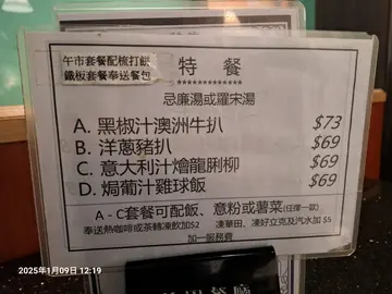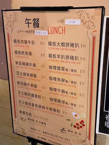 新年仲有午餐下午茶提供,套餐包餐湯餐包。重點係價錢上邊只有+1冇另外的服務費。今次嗌咗個鐵板肉眼,鐵板夠熱,肉嘅份量亦夠多。但係肉嘅質素就始終一般般,但以唔夠$100嚟講係一個唔錯嘅選擇。