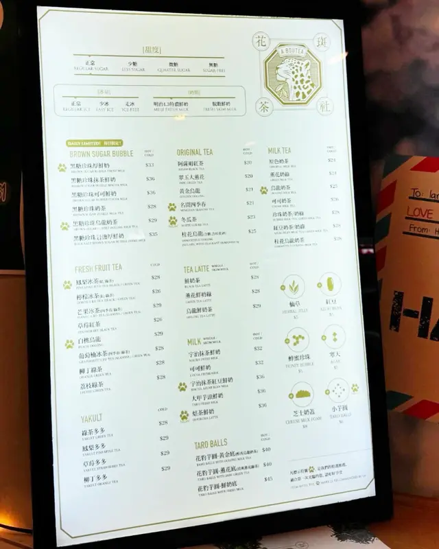 花斑茶社 (駱克道) (銅鑼灣) 網址: https://s.openrice.com/QrbS0NIOB00 地址: 香港銅鑼灣駱克道470號地舖 電話: +852 61124112