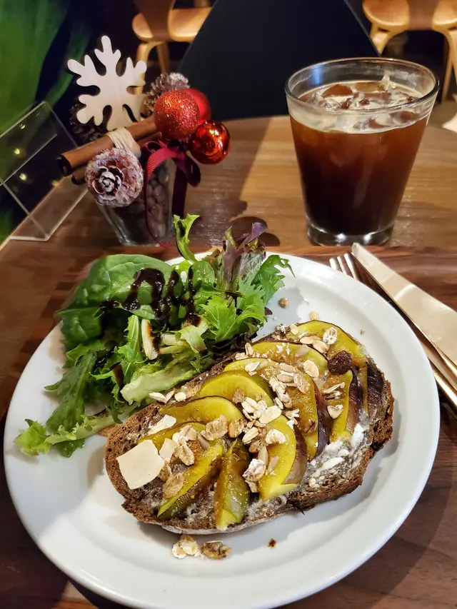 今早已經飲咗兩杯咖啡,現在第三杯咖啡來到中環「花粉熱」試下,咖啡的house blend 是Guatemala &Coast Rica ,店員建議我熱飲,因為甜感會較重啲,但我就想試下凍飲,我選擇了Iced Long Black ($40) , 飲落咖啡有濃郁朱古力味道,有餘韻,不會偏太苦,酸度低,不錯。今次試了份無花果蜜糖忌廉芝士黑麥多士($68),軟腍無花果及多士都帶微熱,上面灑了燕麥碎及提子乾,麵包保持濕軟而麥香味持重,加上香滑微甜的蜜糖及忌廉芝士,配上清新無花果就真是perfect match起初我俾一間放滿花的店舖吸引了我望了一眼,見到花店中都有賣咖啡,所以吸引了我來一試,店中除了咖啡都有供應不同的茶類 ,食物方面除了件裝蛋糕,還有牛角包、窩夫、多士等,環境都好寧靜又舒適,四周都放滿了不同的花卉或植物,仿如一個小花園般,一邊賞花,一邊飲杯咖啡都好寫意,餐廳的環境內也添置了一些聖誕節的裝飾,增添了聖誕的氣氛,同時播放柔和的英文歌曲,輕鬆hea下都不錯的好地方。查看更多