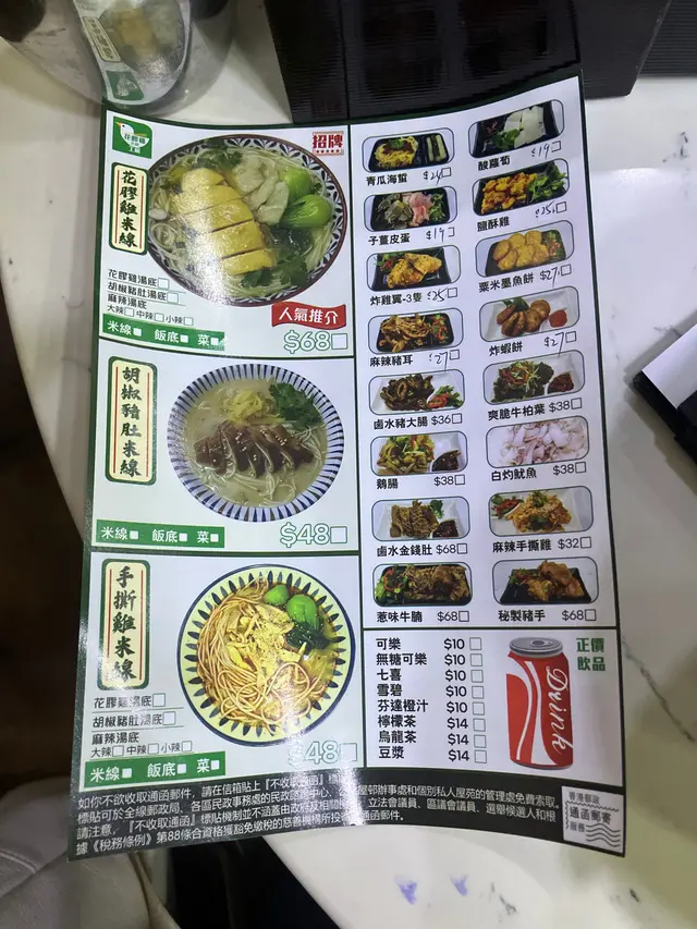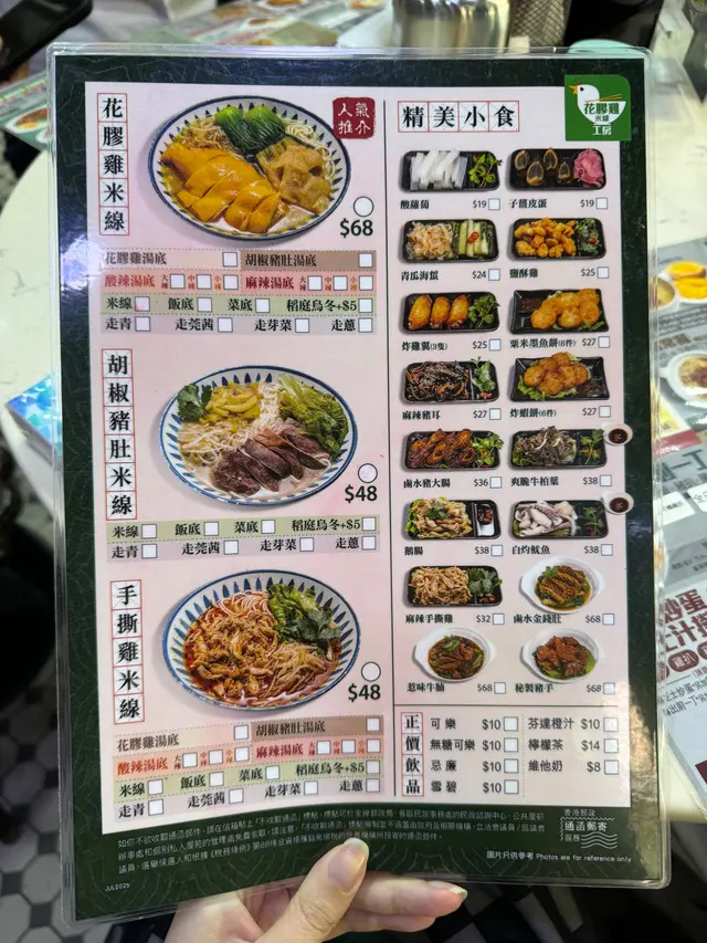 上環米線選擇好多,今次試花膠雞,係對面蘇杭冰室嘅姐妹店,除咗米線,仲可以叫返冰室嘅餐同食物,價錢一樣今日同同事試咗幾款,感覺不過不失,份量係大嘅,米線口感同量都合格,女仔有機會食唔曬,雞就都多,但味道覺得還好,個湯望落好清,唔係expect 中好濃嘅雞湯味,但同胡椒豬肚湯一樣係偏咸,胡椒豬肚湯似以前酒樓點心個種味見到佢有好多新menu,有撈米線,有興趣都可以試下,座位比較少同逼,一食完就要起身走個種,lunch 可能要早少少嚟