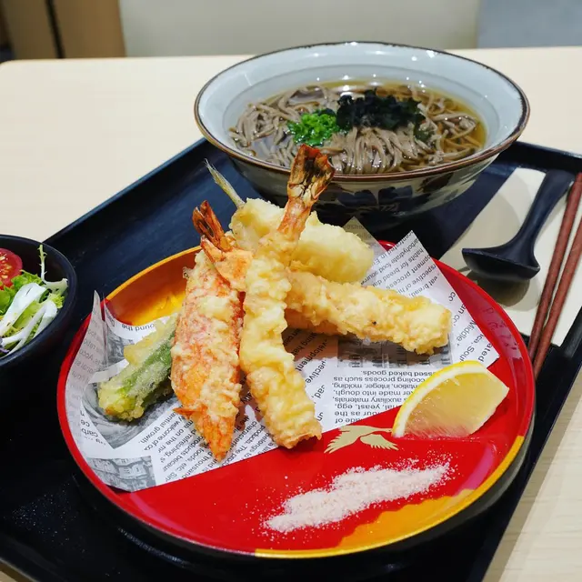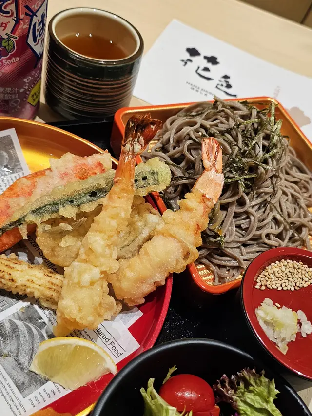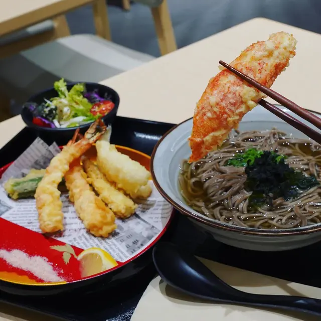 前排見倒荃新天地二期地下多左好多餐廳進駐,一睇先知原來開左個去日本風既美食街「 一門町市場」,入面有好多野食同娛樂商店,今次就試左其中一間日式天婦羅專門店味道都好有驚喜天婦羅蕎麥麵(冷) $138作為餐廳招牌之一,值得一試天婦羅包括虎蝦、蟹柳、鱚魚、墨魚、粟心芯及秋葵,幾鐘意個天婦羅炸粉不厚,酥脆不油膩虎蝦好大隻又彈牙,蕎麥麵配上豉油,加點芥末一齊食更開胃下午茶$48 今次叫左個迷你炸雞丼&迷你烏冬,炸雞外皮香脆,下面既吸收左醬汁更惹味烏冬口感煙韌蟹柳蟹子青瓜沙律 $23青瓜爽口,配上蟹子鮮甜開胃葡萄味波子汽水 $16除左有熱茶提供,佢地仲有幾款日式飲品,波子汽水清甜解膩查看更多