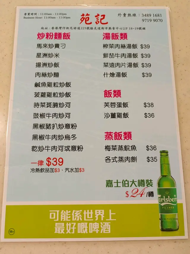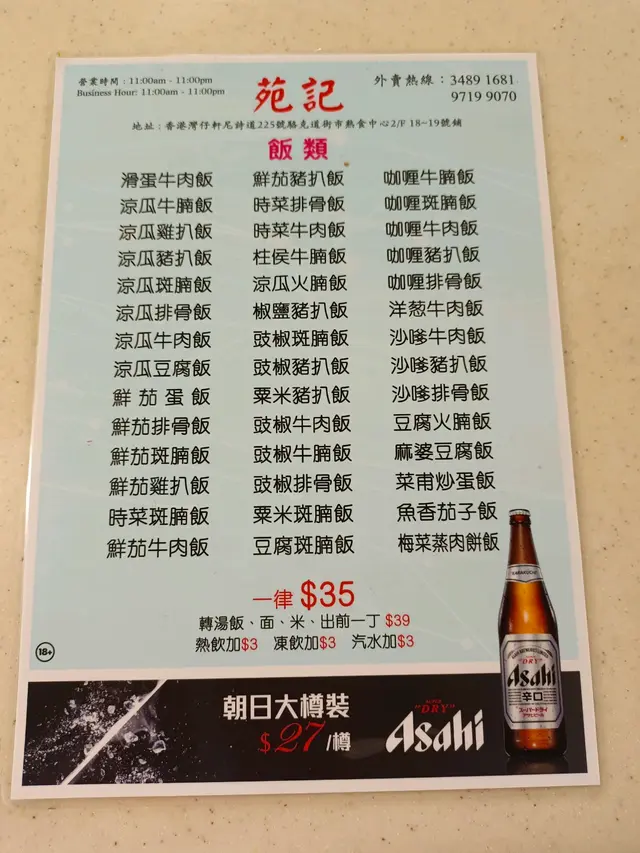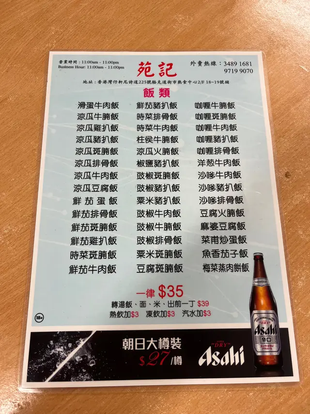 灣仔街市熟食中心入面有好多間茶記,今日黎左呢間苑記。台有好多,不過櫈就唔夠,職員即刻幫我地班左幾張過黎,服務態度非常好👍🏻叫左個粟米斑腩飯(少飯)加凍檸茶(走甜)$35+$3熱飲同凍飲都係加$3,抵讚👍🏻個樣都唔差,叫左少飯真係少左飯,不過都係多左少少🤏正常既粟米斑腩味,以$35黎講味道都ok我幾中意個凍檸茶幾岩味,夠檸檬🍋因為叫左走甜,個姨姨拎黎既時侯有問邊個要走甜,係值得加分既,因為有同事都叫左凍檸茶,最擔心就係調轉左,好多時都會黎到唔知邊杯係走甜,但呢度無呢個問題。整體黎講,唔怕街市嘈左啲啲之外,係灣仔食到$35真係算係平靚正。以下係餐牌:查看更多