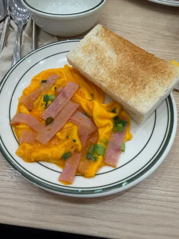 豬扒以前很大塊,現在細很多了。這家茶餐廳早餐的時間很多人,坐了在門口的小圓枱,坐得不太舒適。