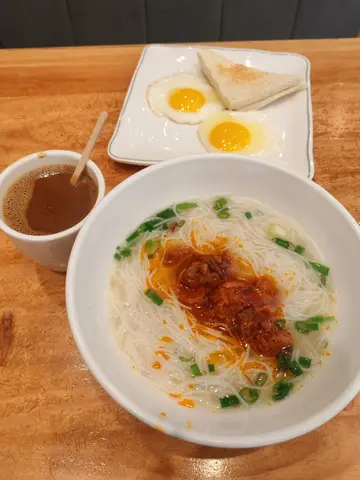 見到呢間喺美荷樓附近嘅連鎖茶餐廳,環境企理又多卡位,除咗街坊仲有內地遊客幫襯,諗住食個早餐,點知係中伏嘅開始⋯⋯食物賣相望落正常,但全個早餐最好味嘅,竟然係塊加$2嘅烘底方包🍞。太陽蛋雖然做到半熟流心效果,但完全唔香,似唔係用鑊煎出嚟咁。至於個五香肉丁米粉更加係災難,個湯淡而無味,完全唔似應有嘅味道😣。杯咖啡☕️都係一言難盡,難飲到令人印象深刻,好難得一個早餐可以每樣嘢都伏成咁⋯⋯食物質素真係不敢恭維,應該唔會有下次。