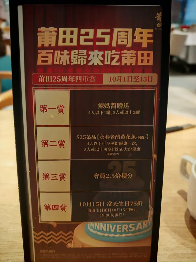 莆田是一間傳統福建菜館,讓人吃到福建料理的純樸鄉間風味。 元朗廣場分店, 以淺木色為主調, 佈置簡潔明亮,環境舒適。 正好餐廳25週年紀念, 10月1號至10月15號 , 餐廳提供不同著數優惠, 粉絲們不要錯過。迷你佛跳牆+閩南紅燒牛腩+金湯時蔬/一人餐細細燉盅的佛跳牆 , 盅裏面放滿山珍海味 ,賣相令人垂涎, 有鮑魚、花膠、 遼參及花菇等矜貴材料, 湯頭清澈, 味道香濃,鮮甜美味, 滋補又養生,啖啖是幸福的滋味 ! 閩南紅燒牛腩牛腩肉質軟嫩, 輕輕力已經好容易 咬開, 牛腩汁惹味開胃 ,伴飯一流金湯時蔬金湯時蔬, 色澤誘人,湯底清甜,時令菠菜 , 鮮甜軟嫩, 十分清爽。興化米粉+ 燉湯 /一人餐幼身的米粉炒得好乾身, 口感柔軟 細滑, 配料豐富, 有蝦粒同蜆肉, 及香芹提香, 鮮味十足, 充滿鑊氣。蟲草花淮山排骨燉湯燉湯經過長時燉製, 湯底色澤金黃, 香氣撲鼻, 入口鮮甜美味 , 滋潤又溫補。普寧豆醬焗鰻魚時令的鰻魚,肥美飽滿,鮮香彈牙, 魚油豐沛 , 甘香的魚油填滿 味蕾 ,搭配了普寧豆醬, 令味道更鮮香濃郁, 滋味提升。甜品拼盤/ 追加🔹️福建黃饅頭 🔹️蒲田紅團 🔹️蒲田印糕福建糕點 , 每款都好特色, 甜度剛好, 風味別樹一格, 值得一試。…查看更多