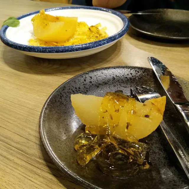 原來店主幾有心思, 用有桂花整既蒟蒻圍住起雪梨下做伴碟, 令到雪梨乖乖咁企起碟上. 另外, 蒟蒻同燉梨有口感反差, 另外白酒香味滲滿著成個雪梨, 所以會好享受食曬成個燉梨![環境] 整潔, 多座位, 地點易搵