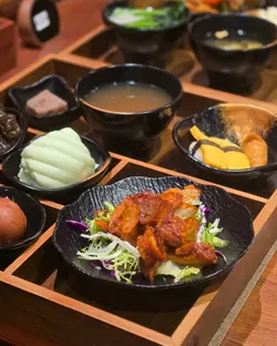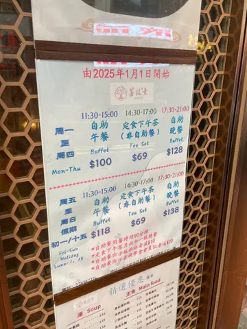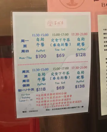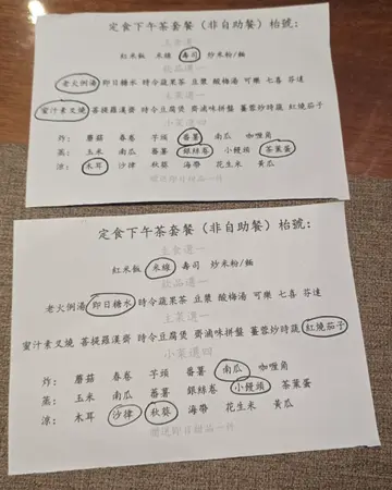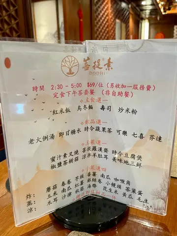 菩提素係蛋奶素店,午市同晚市係自助餐,而下午茶係食一份份嘅定食。去到先比錢,跟住攞住店員比嘅點餐紙返埋位圈低想食嘅嘢食。呢到有包廂同出面嘅座位,當日下午茶時段人流唔多,到我哋離開都只有大約4枱客,但係出面7成嘅枱都放咗粉紅色紙寫住 ‘’留座‘’,所以我哋唯有坐係最尾嘅角落位。整體食物嘅味道同款式同一般嘅素食自助餐差不多、唔會有太大嘅驚喜,我純粹係比嗰九宮格吸引去打卡,我覺得試一次就算。定食下午茶套餐 ($69 +1服務費)時間: 15:00 - 17:00主食選一飲品選一主菜選一小菜選四贈送即日甜品一件主食 米線、壽司米線嘅湯底好夠味,好似一般酒樓食到嘅感覺。飲品老火例湯、即日糖水糖水係雪耳糖水,味道偏淡。主菜蜜汁素叉燒紅燒茄子素叉燒嘅質感偏淋,如果整脆啲就更好。紅燒茄子好惹味,茄子炸得夠脆。小菜炸物: 番薯、南瓜蒸物: 銀絲卷、小饅頭、茶葉蛋涼菜: 木耳、沙律、秋葵炸物嘅皮夠脆,不過番薯比較硬同韌。我哋開頭以為銀絲卷係腐皮包住椰菜粉絲嗰種銀絲卷,點知原來係饅頭。木耳有少少麻辣味。沙律就係薯仔雜果沙律。…查看更多