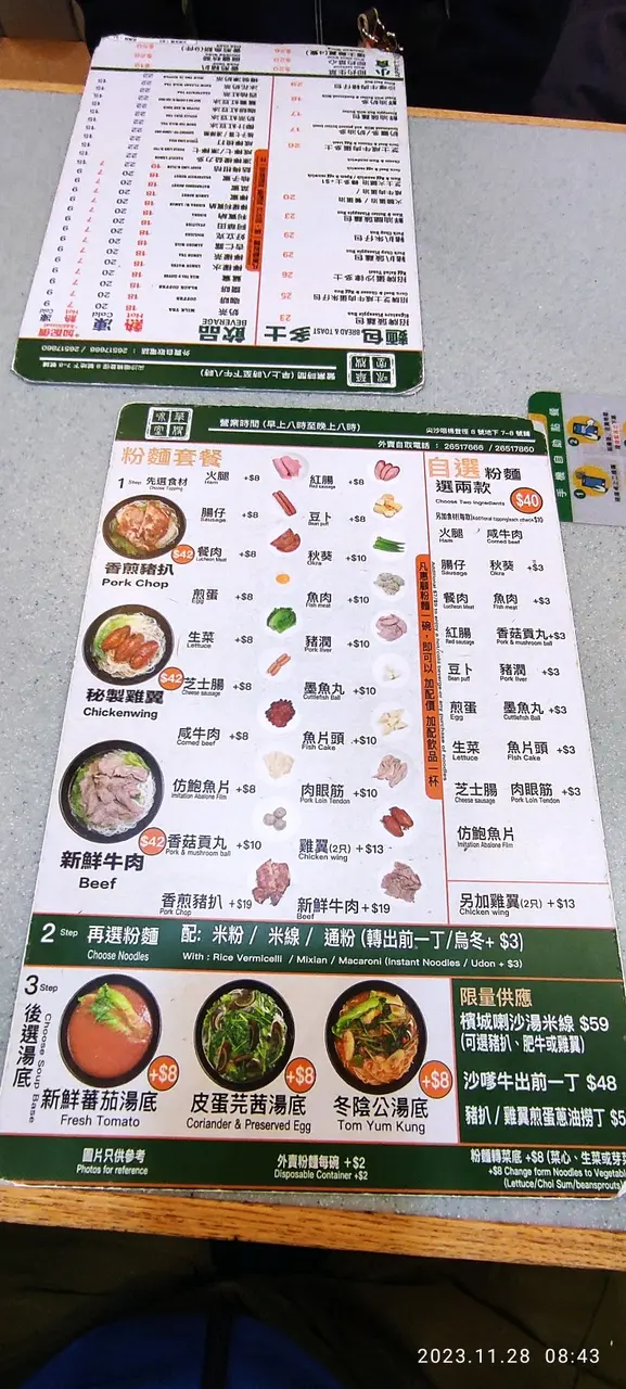 晚餐前時份,下毛毛雨,不用等位。標準遊客模式,服務態度也沒有什麼問題。旁邊客人都以為「粉麵餐」是包飲品,原來亦要加7蚊。雞翼,紅腸,米粉,冬蔭公湯底。雞翼不入味,少少淋,一般。紅腸好像炸過,都可以。但性價比嚴重不足,份量只有平時「福字米粉」一半之米粉份量,湯底其實可以,不會太椰奶,但份量實在太少,可能食客可以食得快d,可以快些還枱。而且遊客店都唔太擔心無回頭客,只是食完好空虛。