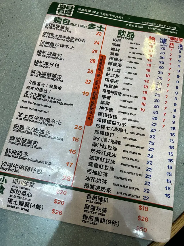 華嫂冰室 (棉登徑) (尖沙咀) 網址: https://s.openrice.com/QrbS0aGW900 地址: 香港尖沙咀棉登徑8號地下G7-G8號舖 電話: +852 26517666