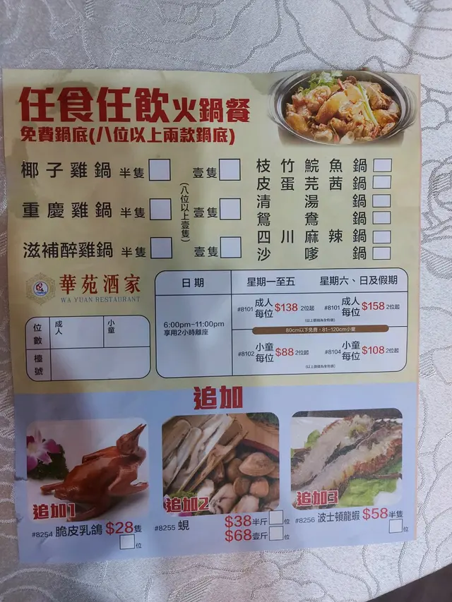華苑酒家 (元朗) 網址: https://s.openrice.com/QrbS0uAK800 地址: 香港元朗安寧路59A號寶豐樓地下至3樓 電話: +852 24781313