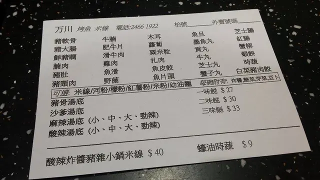 萬川 烤魚米線 (大角咀) 網址: https://s.openrice.com/QrbS01Ru200 地址: 香港大角咀海庭道8號富榮花園第8座地下08號舖
