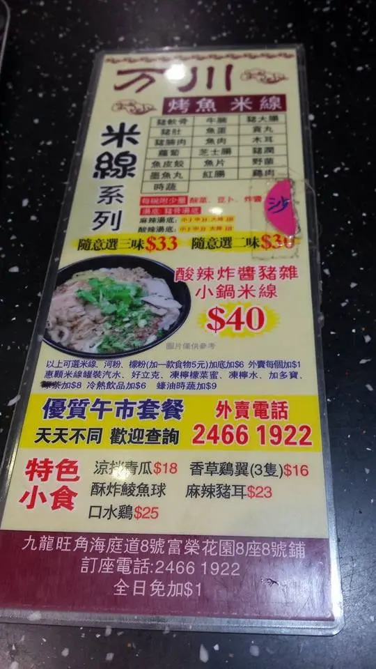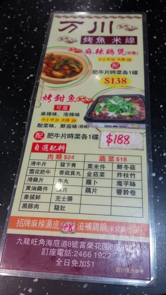 勁@萬川 烤魚米線 wabb0306等級42015-10-08937 瀏覽 關注 万川烤魚米線是一所主攻米線跟烤魚的店家?原來万川這家除了烤魚米線外,還有些港式中餐,炒公仔麵,魚香茄子飯,還有雞煲。店家離兩個港鐵站也有一段路,小妹從奧運站下車,經過奧海城第三期,過到海富商埸,再行前些的富榮花園內,大概在麥當勞的對面。下午茶時份來到,學生哥也蠻多的。價值定位都屬平民,下午茶的自選米線套餐只需$24,比正價的便宜$3。小妹嗜辣,甚麼也會點上辣的,自選紙上的餸菜真的有點花多眼亂,選擇困難症的小妹也不知選那個。小妹每次吃米線也會點上腩肉,所以不猶豫下點了腩肉。豬大腸,豬軟骨,滑牛,牛腩跟蝦餅也看似不俗。最終小妹點了個兩餸米線,滑牛腩肉勁辣酸辣米線$27 。環境方面,店家的空間不寬闊也不算狹窄。座位有卡位也有普通圓椅子,若一大把人座會有點窄。牆上大概展出些是日午餐或晚市烤魚鍋。店員大概是兩位姨姨,落單也頗快手。上菜那湯底已經湯頭辣油滿滿一層,加上蔥花,那呈橙紅的麻辣油層,略帶點辣椒碎片。湯頭是四川的香辣味,麻香帶嗆的辣椒片,稍辣的湯頭令米線更惹味。米線 軟身,帶點點嚼性,浸透勁辣湯底的味道,入口不會過份軟爛也不會硬至咬不開。米線附送芽菜,酸菜,蔥粒,豆卜。佐料也頗佳的,不愛吃的可以剔除掉。滑牛 呈粉嫩粉嫩的啡色,份量也頗多的,大概有五六片牛肉,牛肉用些鬆肉粉醃製,口感又嫩滑且濃郁辣湯味。牛肉肉質去取根,沒有半點嚼不開的情況。腩肉 的脂肪的比例較重,腩肉的瘦肉滷汁入味。腩肉的皮帶爽,油膩感稍重,入口啖啖肥膏肉。真的不得不大讚這家米線,小妹吃過後就天天在想念他的好!但小妹也受罪了好幾天,差點屁股也著火了。每逢吃辣東西,也會受罪的,但這個勁辣辣度米線,是留給強者的。小小有趣事,鄰座點菜的叔叔點奶茶,店員說沒有奶茶咖啡供應的。原來店家沒有製絲襪奶茶的工具,廚房也比較狹小,所以這家店是沒有奶茶跟咖啡的,若你想喝要注意注意!…查看更多+ 7以上食評乃用戶個人意見 , 並不代表OpenRice之觀點。10分享勁@萬川 烤魚米線 萬川 烤魚米線 https://s.openrice.com/QrbT03Iic00檢舉 張貼 評分4味道4環境4服務3衛生5抵食用餐途徑堂食