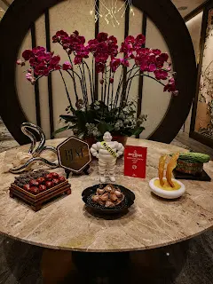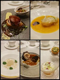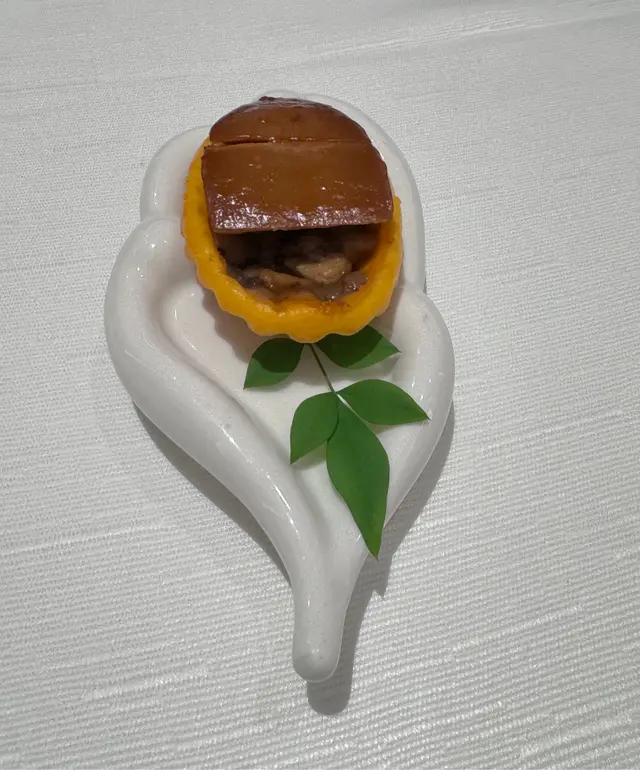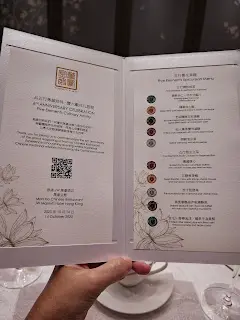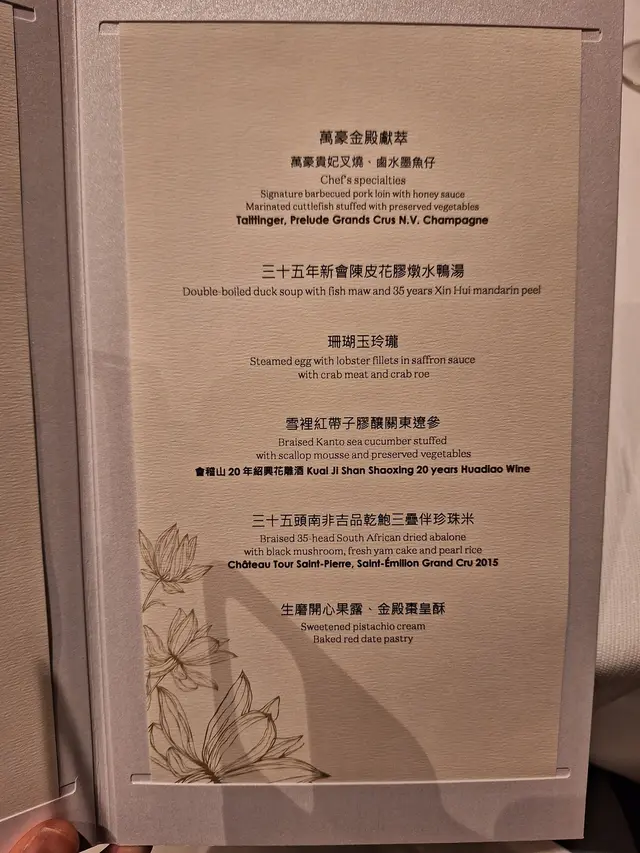 為慶祝萬豪金殿六週年紀念,餐廳特別推出只做一天的五行養生菜譜,嚴選屬性金木水火土不同食材、配合創意烹調,做出精緻矜貴菜式;優惠價每位$1888。甫進中菜廳,即見食材展示,誘人垂涎!餐牌上亦以不同顏色展示金木水火土不同屬性的菜式,可見用心!這晚的菜式,全部皆非常精彩,看得出廚藝了得,創意組合,中西混合精髓,卻不失傳統味道,我最欣賞各款湯汁,真係食到舐舐脷全清碟!五行調和前菜:翡翠豆仁、羽衣甘藍汁口感清新,羽衣甘藍汁內混合了青瓜及蜂蜜,先飲這涼涼地帶甜的菜汁,然後吃一口豆,有如清洗口腔一樣,味蕾準備就緒,迎接精彩菜式!蜂巢流心酥貌如芋角,內心看似普通雞蛋,實是乳扇及鵪鶉蛋做成的,碟底有粟米汁調味,稱職的香口小吃。老菜脯陳皮乳鴿腿做得出色,鴿腿外皮非常酥脆而又肉嫩,內心釀入老菜甫、韭菜及陳皮,輕輕的,餡料味道不強烈;老菜甫補腎,這是一道屬水的菜式。仙人掌果蟹肉凝膠做得精緻漂亮,不過味道不算特出,海帶與仙人掌做啫喱杯,內藏鮮蟹肉。胡椒淮山湯這個湯真不錯,胡椒夠香辣,淮山蓉口感似薯仔很討好,溫度超熱,口感實在。五行相生主菜:棗爾稱心心機卷物,組合及醬汁皆有心思!屬火的菜式,顏色也是紅與黑,原條關東遼參,裏面釀入打成蓉的雞肉,而雞肉又包著鹿筋,三層口感,喜歡刺參煮至軟透入味,並非坊間不少做法為保形態而硬掘掘!黏黏膠膠,膠原豐富中有肉香,再配以紅棗及蓮子做的糊仔醬汁,鹹甜交替,美味無比,我用匙羹把汁亦吃清!花膠蕉香蝦咬落真有趣,香蕉味道明顯,竟想得到有如此組合而又合得來。炸花膠作春卷皮,餡料有蝦膠,而香蕉又釀在蝦膠內,外脆內軟,香蕉的甜成功令味道昇華,味蕾新感受!尚有健脾的南瓜與小米作醬汁,整體充滿新鮮感,味道非常好。杏汁琵琶燕白色的食物屬金,益肺。原盞半煎炸燕窩,配合以石班粒、馬蹄、杏汁及雞湯混合的湯汁,味道很不錯。黑虎掌鴨卷伴乾燒鮑魚味道最濃郁,令人最容易想起的一道,靈魂在黑虎掌,這款菇香氣非常濃郁。雙主角除了有26頭南非吉品鮑之外, 下面的卷物以豐富的黑虎掌釀入鴨肉卷內,芬芳特色,味道濃郁,吃完之後,再加進一口黑蒜飯,混合剩餘的醬汁,剛剛好,吃得滿足!涼瓜汁青檸泡沫、蘋果牛油果酥最後的甜品也非一般,涼瓜汁泡沫,混合了奇異果及桃膠,一點也不甘苦,面前即場刨下青檸皮,添加酸酸地的味道,非常解膩。蘋果牛油果酥,牛油果青蘋果做餡料,加上金箔,清新輕盈。全晚上菜過程中,服務員皆細心解說,配合私人房間,朋友賜酒,真是盡興的一餐,感謝大家的安排及邀請。萬豪金殿的 Jason Tang 、是最年輕的米芝蓮星級大廚,一向創意無限,據說這五行養生菜譜始創於 2018年,因為工序繁多,並非長期供應,有興趣的有好消息,菜單會在11月推出。…查看更多
