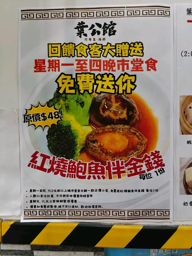 對港式小炒情有獨鍾,聽說長沙灣的葉公館性價比高,決定到店試試。🤫「晚市孖寶$218」蒜蓉粉絲開邊蝦 「孖寶小菜第一款」開邊蝦是小蝦,但味道不錯,醬油調味不錯。如果再多點粉絲會更好。雙喜小炒王 「孖寶小菜第二款」小炒王香口,很有獲氣,很大碟。老壇酸菜魚不過不失。味道沒有很大的驚喜感。火焰棟企雞 精彩,抵食,好味,雞肉滑溜。椒鹽鮮魷熱氣但新鮮好食,脆口又彈牙。片皮鴨 最喜歡吃片皮鴨,不過這片皮鴨較乾,肉質較粗糙。街坊小菜價格合理, 性價比高,埋單後會免費送上紅豆沙