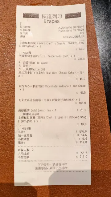 <Grapes_hk>定期有live歌手唱歌🎤 可以點歌🔥 餐廳氣氛超浪漫✨ 食物質素又高~無論約會定同朋友聚會都啱晒💋 #mochicouple_hk太子搵食團⸝⸝⸝♡ ꔛ ꔛ ꔛ ꔛ ꔛ ꔛ ꔛ ꔛ ꔛ ʕ´•ᴥ•`ʔ ‧˚ 1️⃣ 主廚秘製雞翼(原味) 8pcs ($78)炸得金黃香脆✨ 外層一咬即爆脆💥 裡面肉汁滿滿🤤 每隻雞翼都入晒味,咸香中帶少少蒜香~完全唔油膩👏🏻!啖啖肉又爽口!原味最能食出雞香精髓🐔 無多餘醬汁遮蓋💛食到尾聲都依然香脆!2️⃣ 美國特級牛街80oz 5成熟 蒜蓉汁 ($238)超厚切牛排🥩切開仲見到粉嫩肉色💖 牛味濃郁、有咬口但又唔韌,肉汁滲滿蒜香🤯 每啖都多汁得誇張,5成熟係完美熟度!🔥 蒜蓉汁為牛排添層次感,香而唔嗆~3️⃣ 芝士香草汁焗龍蝦(半隻)配龍蝦汁海鮮意粉 ($188)🦞💫 龍蝦肉彈牙爽口,每口都充滿海味🌊 芝士香草汁濃郁奶香,完全包裹龍蝦~邪惡得黎無得輸🤤 海鮮意粉更係驚喜!入面有三文魚腩、青口、蜆肉、蝦~每條意粉都吸滿龍蝦汁精華💥4️⃣法國生蠔Gillardeau ($58)呢隻生蠔係出名高級品牌!🇫🇷 一啖入口超creamy~鹹香中帶甜味,冇腥味👏🏻 口感滑到好似牛奶咁順🫶🏻 配少少檸檬汁或紅酒醋一齊食,味道層次更明顯!新鮮度超高💯 每粒都好飽滿,係完美開胃之選!5️⃣紐約芝士餅(自家製) ($48)甜品控必點💛 一濃郁芝士香🧀 質地厚實又綿滑~☁️ 味道唔會太甜,芝士味剛好平衡酸甜💗 自家製果然有誠意~6️⃣ 朱古力心太軟配雪糕 ($48)經典甜品王者登場🍫✨ 外層香脆、內層流心濃厚~朱古力一切開即刻「爆漿」🔥 熱騰騰心太軟撞上冰凍雪糕🍨,口感反差好正~甜度控制得好好,唔會膩🤎⸝⸝⸝♡ ꔛ ꔛ ꔛ ꔛ ꔛ ꔛ ꔛ ꔛ ꔛ ʕ´•ᴥ•`ʔ ‧˚ 🌟想知道更多美食🤪記得follow@mochicouple_hk啦😍🎉📸📍大角咀埃華街84號🚇太子站C2出口,步行約16分鐘…查看更多