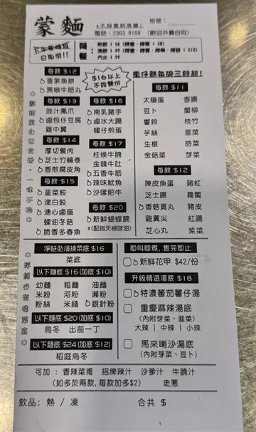 中學以來就知道蒙麵的存在,但是那時候,這家小店並不起眼。時光飛逝,已經過了10多年,原來仍然有間叫蒙麵的小店。雖然不知道是不是同一間,但是這間蒙麵變成了人氣的車仔麵店,每每經過都是排隊的人,終於的起心肝一個放工的晚上,走去排隊。雖然門口條隊唔長,但係都排了超過半個鐘,因為小店座位實在太少。在排隊期間已經寫好單,所以一坐低好耐車仔麵就上枱。一個沙嗲汁金錢牛肚、滷水大腸,脆皮多春魚配幼麵。另一個是腩汁蠔仔煎蛋、滷水牛腩、辣味魷魚。拌麵送上的是一大茶匙芫荽蔥蒜,這個值得讚!辣味魷魚是獨立另上的,辣汁做得十分不錯,但是魷魚略嫌沒有脆身,食落有點腍。香辣菜甫是免費的,味道不錯。車仔餸的款式,比起其他車仔麵店,多了特別款,麵底也可以有瀨粉和銀針粉的選擇。蠔仔煎蛋大大件,食落不錯。脆皮多春魚同個名一樣,成條脆卜卜可以食晒!至於其他車仔餸,感覺比較正常水準,沒有很特別。招牌蜜汁叉燒係幾好食,不過焦黑的地方,要搣返出嚟,不過細細串$35,性價比低了點。至於重點湯底,就比較失望。完全唔濃,或者我們沒有升級湯底,有沒有試到招牌辣汁,所以這個湯底對我們來說,真的很普通,或者期望越大,所以失望也有點大。如果不揀招牌辣汁,又或者唔會升級湯底的話,這碗車仔麵唔會太吸引我回頭。尤其如果門口有人龍,更加唔會再排隊食多次。…查看更多