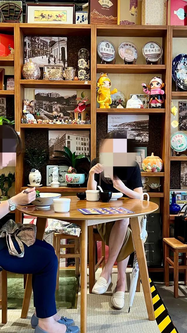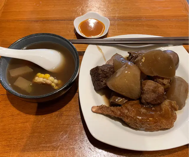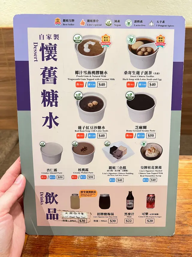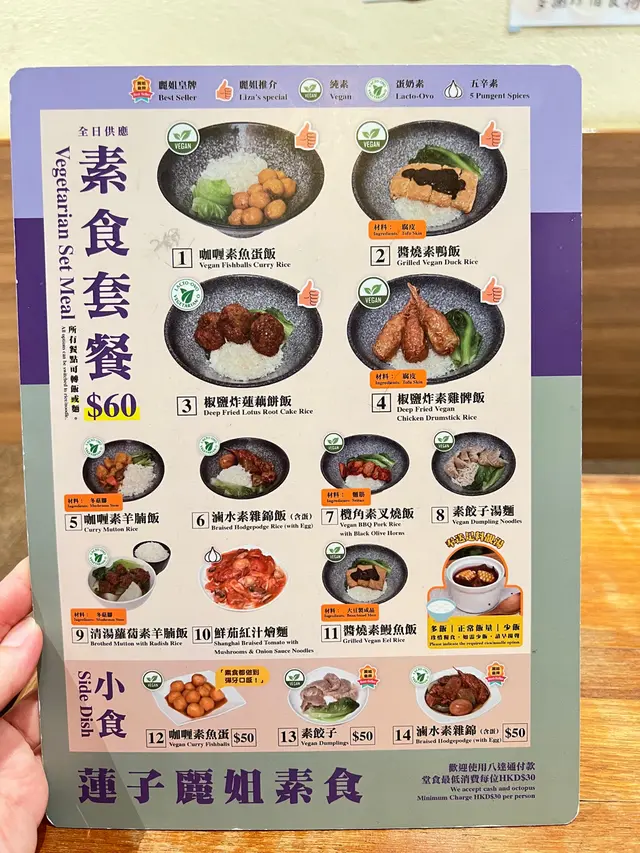 在灣仔經過下午茶時間很多舖頭六點才開放時間大約5:30就選擇了麗姐素食環境清幽裝修舒適雅致很有60年代的風格全木傢俬下午茶時間人比較少坐得舒服看見餐牌價錢不貴經濟實惠於是我們四人各選了一人套餐例湯欖菜叉燒飯有驚喜叉燒做得剛剛好欖菜清香美味第二道素餃子烏冬,清湯有味清新有蔬菜香餃子多汁好味我們還後加了一碟素餃子再加一個滷水飯雜錦都是蘿蔔麵筋腐皮有滷水香味再選了一個數魚蛋咖喱有咖喱香彈牙有驚喜做得很好。素湯有清香蔬菜味我們還點了三字黑麥汁飲品,清香麥味值得推介 四人大約吃了總值300多元非常抵食套餐實惠一個人也可以以輕鬆素食享受舒適懷舊環境值得推介平靚正的素食滋味還認識了超好人的麗姐!在這個速食時代用心做素食的餐廳,很少值得支持推介