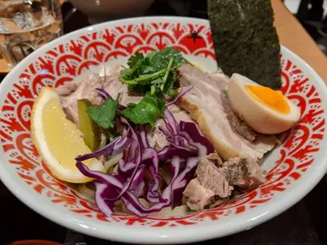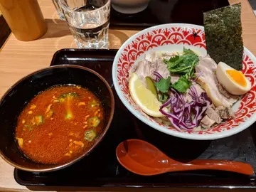 日本拉麵過江龍香港都有好多,差不多每幾個月就有一間新的過江龍拉麵店開辦,在香港這個競爭激烈的拉麵市場,那就肯定要有特色才能吸引到食客,所以這家算是比較特別的蕃茄湯底的沾麵是一大賣點!這家店剛開幕的時候有買一送一的優惠,那機智的我肯定馬上去嘗鮮啦!我去到的時候門口還沒有太多人在排隊,夠鐘開門後,很快就入座了。我這次就叫了達人招牌蕃茄汁沾麵,第一次肯定是叫招牌的!因為不是最好吃的也不會叫成招牌吧!拉麵送到後,有叉燒,叉燒粒,檸檬,紫菜和半個流心蛋,旁邊紅紅的就是招牌蕃茄汁了。先嘗一嘗湯底,湯底的味道不夠濃和有點稀,如果作為沾麵汁來說應該不太合格了,因為這樣麵就不能掛湯,變得很淡很淡。再者沾麵一般是比普通的拉麵是濃烈一點的,所以以這湯底來說不太好。麵條方面,個人認為有點煮過頭了,太軟了,而且還有濃濃的鹼水味,比湯底更濃……其他配料都是正常的,沒特別。…查看更多