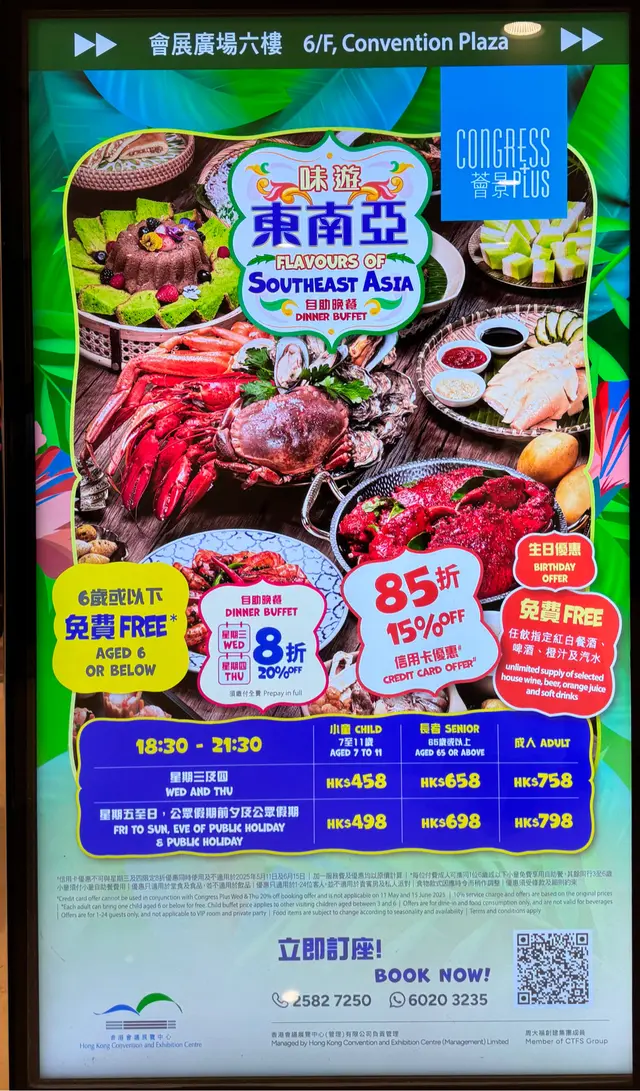 今晚同兩個仔衝去灣仔會展 #薈景 食東南亞自助晚餐,兩個為食仔見到成排甜品櫃🎂👦👶即刻眼發光!重點係 ‼️ 望住維港日落開餐🌅,啲雲仲係粉紅色㗎,影相靚到癲📸🔥必食亮點✅ 冰鎮海鮮山:龍蝦🦞+長腳蟹🦀+爆膏海蝦!大仔 自己KO咗3隻蟹腳✅ 即開生蠔吧🦪仲要係開 Fine De Claire 配柚子紅醋,Fresh到震! ✅ 新加坡辣椒炒蟹🌶️ 辣辣地超惹味✅ 魔鬼魚+肉骨茶+炸雞:香蕉葉燒魔鬼魚好香口,真係好有新加坡風味😋仲有脆卜卜油條浸湯食! ✅ 自選麵檔:細仔狂讚海南牛肉麵🍜,爸爸就搶食叻沙~ 🍨甜品控暴動區斑蘭椰香米糕💚+紫薯千層糕💜+爆漿椰絲球🤤 重點⭐️⭐️成個甜品Corner勁多選擇,兩兄弟食到咀仔花花🌸💰價錢參考平日成人$758|小童$458 週末/假期成人$798|小童$498 (供應時間⏰:18:30-21:30 星期三至日+假期) 蒸魚係用斑🐟唔係普通沙巴龍躉!海鮮同食材全部靚貨,啱晒嘴刁一家大細…查看更多