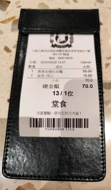 今天下午 ,我去到 九龍城啟德體育園啟德零售館3, 1樓舖蘇哥清湯腩 (九龍城) 午餐。清湯金錢肚幼麵 $55.我點了清湯金錢肚幼麵,湯底清淡,金錢肚鮮嫩,麵條滑順,十分美味。油菜-菜心 $15接著,我還點了油菜-菜心,味道清新,搭配的蒜頭更是增添了風味。最後,我埋單的時候,只需70元,還免加一,真是十分划算。餐廳的服務也很好,服務生熱情周到,讓我的用餐體驗更加愉快。整體而言,這次的用餐非常滿意,未來還會再來光顧!