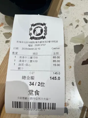 同fd咁啱經過,就諗住入去試下,結果都唔錯,唔會伏🙈1️⃣清湯牛三寶➕菜心:牛三寶係包括牛筋、牛腩、同金錢肚。 我係配河粉。 牛筋有咬勁,好啱我個人口味,如果鍾意腍啲嘅可能未必啱食。牛腩好厚好有牛味~ 金錢肚就中規中矩,正正常常😋 叫咗一疊菜心,好足料,兩個人食都夠😋 唯一可以挑剔嘅就係環境,檯面比較油,潔癖人士可能會介意🙈同埋冷氣機滴水🥹🥹價錢合理,服務態度都幾好,同佢講滴水,即刻幫我哋處理~