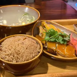 二訪位於太子嘅蘇山雞飯今次特登下午茶時間嚟encore海南雞飯🐓天氣太熱放棄咗椰子雞煲 冬天一定要再凱旋歸來先得😎🔸 招牌海南雞飯 上枱嘅時候已經覺得海南雞賣相出色雞肉無骨嫩滑 皮肉之間夾咗層啫喱配埋油飯 及 三款醬汁:辣汁、薑蓉同甜豉油令雞肉味道層次更高冬瓜湯加入雞雜更加鮮味 冇半點腥味入口充滿雞同冬瓜嘅自然鮮味🔸 扎肉手撕雞湯粿條 粿條偏粗身 質地軟滑 夾嘅時候好易滑走!一絲絲嘅手撕雞同扎肉 口感層次豐富湯底清甜有雞香 滿足! 🔹 麻辣玻璃魷魚通菜 通菜面頭鋪上爽脆玻璃魷魚再拌上濃郁嘅麻辣汁 辣度適中 反而香氣突出🔸 夜市沙嗲(牛肉/雞肉)分別有2枝牛肉/雞肉串 兩款肉經醃製後燒至外層微微焦香沙嗲醬香濃惹味 有粒粒嘅花生 甜甜辣辣🔹 雪糕薄荷朱古力咖啡用一球薄荷雪糕作點綴濃郁嘅咖啡雪糕半溶落咖啡令咖啡苦中帶點甜 幾特別🔸 凍金裝柑桔蜜用上新鮮青柑桔 味道天然 清新解膩!🚩蘇山雞飯 太子彌敦道759-761號藍馬之城地下2-3號舖…查看更多