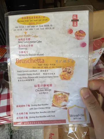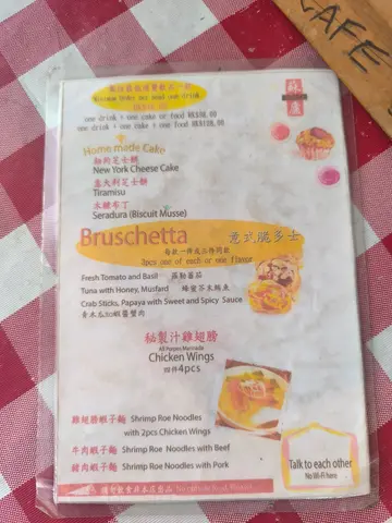 行完山終點站在大澳,正好在大澳食個下午茶.小小的大澳漁村除了小食店外, 茶室,海鮮小菜飯館,也有特式小cafe. 在網上看到這間cafe原來都開業已經有13年,於是入去試試. 另一個選擇此店是因為餐廳户外部份是由高腳棚架搭成, 而且旁邊是河道. 完完全全可以感受及體驗住在大澳棚屋的特別.餐廳應該屬於家庭形式,所以食物及飲品選擇不多. 簡簡單單. 朋友選擇雞翼蝦子湯麵(朋友感受:蝦子麵少許蝦子味,不過雞翼肉質麻麻唔夠嫩滑)& 冰釀精品咖啡(不多冰凍有咖啡香)我自己選擇紐約芝士蛋糕&熱紅吸咖啡加奶(可以選擇不加奶) ~ 2樣都算正常, 沒有什麼特別.總結, 感受大澳的寧靜及慢活.飲杯咖啡欣賞下旁邊風景. 不過,星期六,日及公眾假期人流太多,座位有限,也不可以坐太耐😅…查看更多