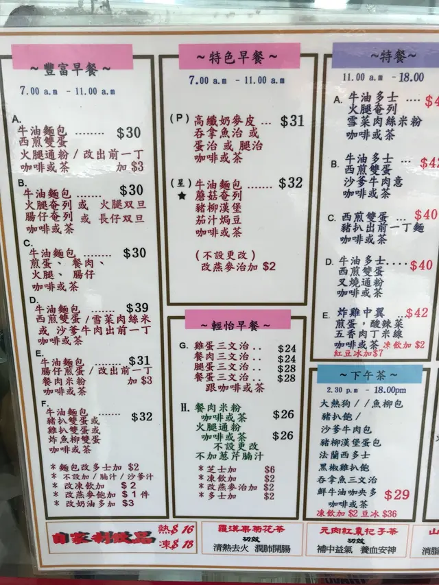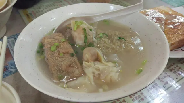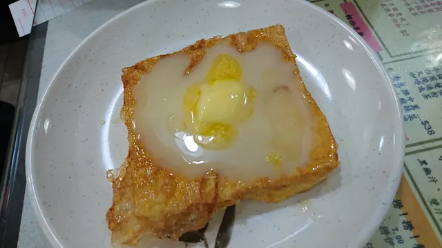 With a street full of many cha chan tengs, boyfriend and I were curious as to why this was the only one that was busy and full.  Boyfriend and I went in for a snack break to see what this was all about.Apparently this is a favorite among the residents in this area. According to the photos, on the wall, this place has been opened for a long time and is a staple in this community. Small and cramped, this was your typical busy cha chan teng. Menu is in Chinese only.It was also interesting to see that each table had a bottle filled with water. At first we thought someone had left it behind but then we noticed each table had one. And people were pouring it into their glasses to drink!I ordered an afternoon tea set of French toast and an ice lemon tea ($28). Pretty cheap! The French toast was quite good. There was peanut butter in the middle. It was generously doused with condensed milk and a slab of melting butter. The bread was lightly coated with egg so it was not too heavy and dense when it was fried. Pretty delicious!I  can understand why it's so popular here. The prices are cheap. The food was quite decent and arrived fast as well. The ice tea was not that great.查看更多