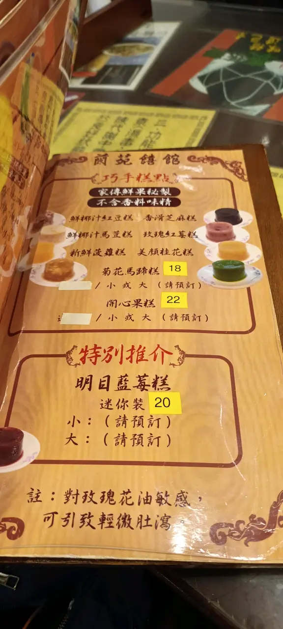 唔係陪朋友黎食龜苓糕,行街唔會行到呢個位。隱身太子街角的蘭苑饎館,二十年來以養生聞名,近期推出的古法糕點都幾得意。今次試埋菊花馬蹄糕與開心果糕。 晶瑩剔透的菊花馬蹄糕,以杭菊熬煮成凝凍基底,馬蹄粒如繁星鑲嵌其中。入口先綻放清雅菊香,繼而迸發馬蹄脆爽多汁。更令人稱奇的是開心果糕,墨綠玉色透著堅果油光,採用伊朗開心果研磨成漿,濃郁果香在椰香襯托下層次分明,軟糯彈牙的質地顛覆對中式糕點的想像。 店內木雕窗櫺映著老香港風情,點心師傅堅持每日現做限量供應。建議午後造訪,易搵位。…查看更多
