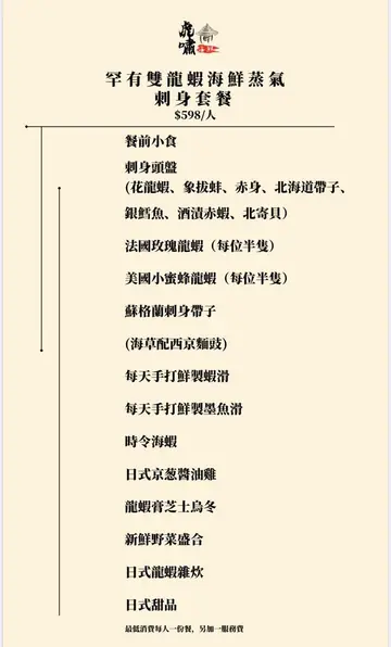 這間虎嘯海鮮蒸鍋主題餐廳 主打雙龍蝦海鮮蒸氣刺身套餐,因為食材夠新鮮性價比高。刺身頭盤: 有花龍蝦刺身、象拔蚌刺身、北海道帶子、銀鱈魚、赤蝦(巨型牡丹蝦)、北寄貝,每樣少少 勝在夠新鮮。雙龍蝦分別係法國玫瑰藍龍蝦 和 美國小蜜蜂龍蝦,每人每樣半隻,藍龍蝦有鉗,小蜜蜂花龍是沒有鉗的,兩款龍蝦都新鮮結實好味,以藍龍蝦更為鮮甜。其他海鮮有:海草面豉湯蒸帶子、手打蝦丸、墨魚丸 都相當出色。特別是京蔥醬油雞 是用新鮮雞 醃得入味,蒸嘅時間掌握剛剛好,嫩滑有雞味。最後龍蝦粥吸收曬所有海鮮的精華,正!甜品 : 伯爵茶雪糕蛋糕 啖啖濃郁伯爵茶味道。