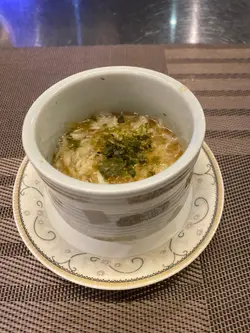 「茶碗蒸」蛋液滑嫩,高湯鮮美,內藏銀杏與雞肉絲,簡單卻見功夫。 海鮮部分令人驚喜-「鮑魚」彈牙入味,「龍蝦」飽滿鮮甜,以鐵板燒做法鎖住原味;「虎蝦」肉質緊實,「銀鱈魚」甜嫩多汁,魚皮烤得微焦香脆。