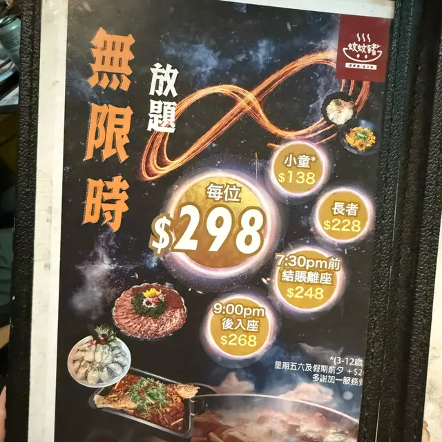 位於太子❣︎蚊蚊豬老火鍋❣︎而家做梗無限時任飲任食火鍋放題,價錢只需$298咋😱性價比超高👍🏻👍🏻頭盤每枱都會贈送時令蒸海鮮🦞之後就可以自己任揀食物,四川烤魚🐟四川雞煲🐔唔同款式牛肉➕日式刺身➕多款火鍋配料➕小食➕雪糕🍧等等⋯⋯全部都係無限時任飲任食架😍5:30入座食到凌晨12:30都得,連啤酒🍻都係任飲🤤仲要有支裝青島添,好岩同朋友吹水傾偈講是非👍🏻宵夜必到之處。☆彡推薦以下必點系列😋ミ★❣︎頭盤時令海鮮🦞🦐🦀❣︎內有膏蟹🦀鮑魚,生蠔🦪鮮蝦同花甲,所有海鮮都係店主每日新鮮攞貨😋👍🏻仲會揀時令海鮮🤤保證新鮮,樣樣都好鮮甜,仲洗得好乾淨無沙添。❣︎三文魚刺身❣︎三文魚鮮甜豐腴,非常肥美😋👍🏻好有質素。❣︎泡椒魚皮❣︎魚皮爽滑Q彈,醃得酸辣麻香😋👍🏻攞來送啤酒一流。❣︎封門柳❣︎封門柳肉質柔軟,肉味濃郁😋👍🏻❣︎自家制炸響鈴❣︎呢到嘅響鈴即叫即炸架🤤👍🏻攞來打邊爐索晒啲湯汁,酥香味鮮,口感超好。❣︎雞子❣︎雞子唔係度度有架,呢到都包埋,仲要大大粒,漲卜卜😋👍🏻❣︎陳皮魚蛋❣︎呢個都係任食火鍋少見,魚香鮮甜,陳皮味回甘😋❣︎香脆炸饅頭❣︎饅頭都係即叫即炸🤤👍🏻炸到金黃酥脆,內裡軟綿,沾埋煉奶一齊食,當做甜品一流。…查看更多
