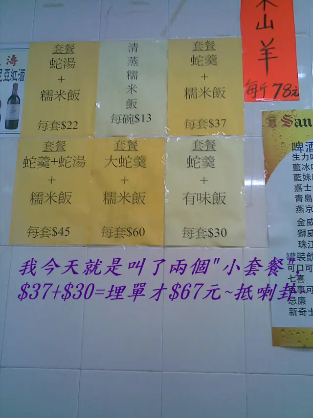 琴晚同朋友搬完屋..食左飯架啦.但搬完出完力又想食過..涼涼地之下..最後決定去左依間蛇王濤食蛇!! 小蛇羹 + 糯米飯蛇羹入口好多料..肉C,木耳C,冬姑C,蛇肉C..但感覺真係好似之前的師兄話齋..這是一碗<足料碗仔翅 >本生想叫”味飯” , 以前食過好好食..老闆娘話無整..只得糯米飯..