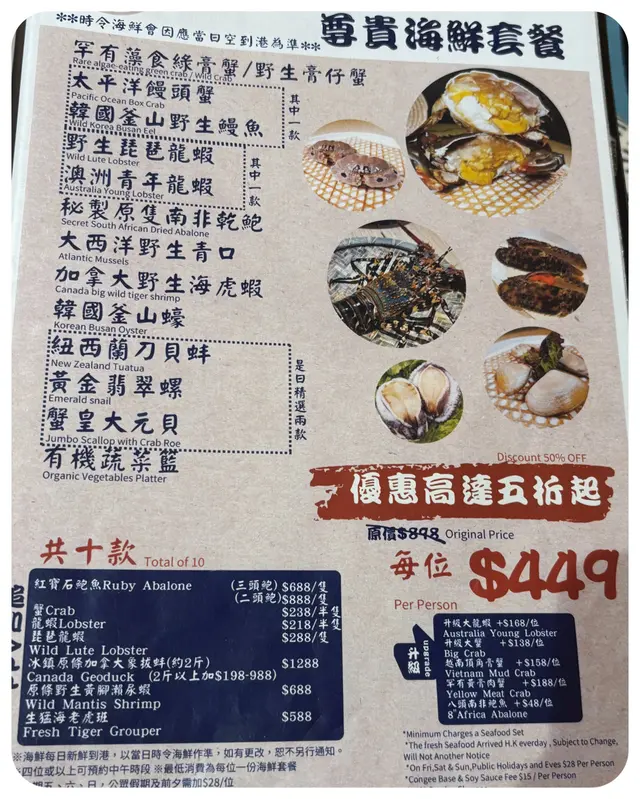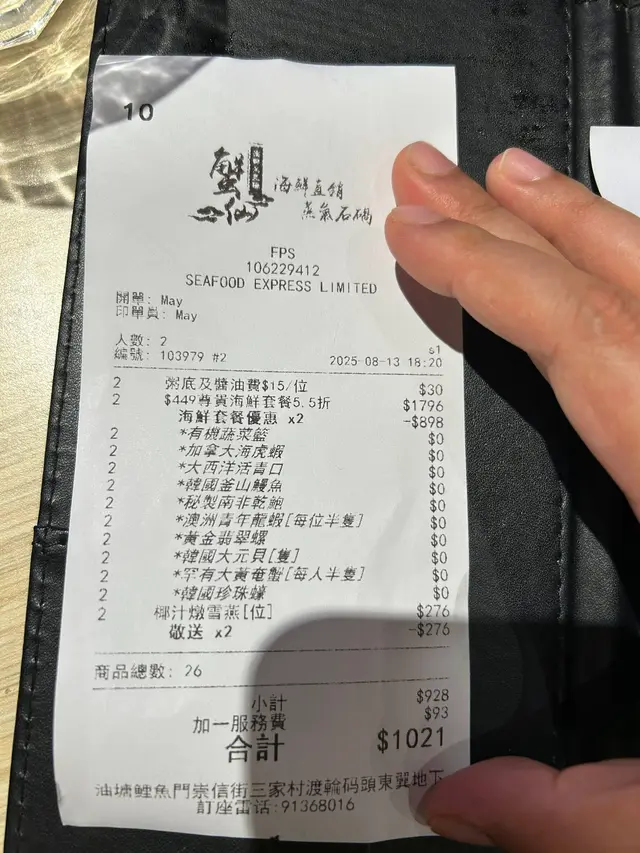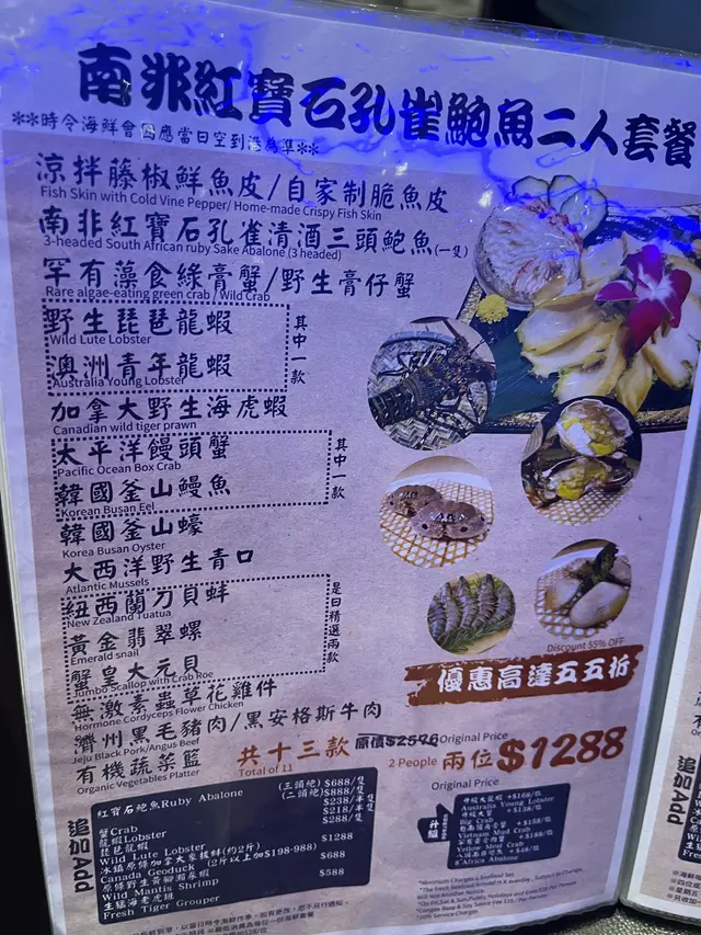 「尊貴海鮮套餐」:嘩!成枱擺到滿一滿,睇見都興奮!有機蔬菜盤:食咁多海鮮都要平衡下,啲菜翠綠爽甜,索晒啲海鮮精華甜到不得了。加拿大海底蝦:大大隻,蒸完蝦殼紅噹噹,蝦肉結實彈牙,鮮味係咁標出嚟。大西洋活青口:隻隻都咁肥美,一啖一隻,海水味好濃,又唔會有一絲沙,正!韓國釜山鰻魚:魚肉肥美又唔腥,皮層充滿膠質,蒸完油香四溢,滑溜到呢~秘製南非乾鮑:哇,呢個係重頭戲!鮑魚本身已經好厚身,加上秘製醬汁咁一蒸,入味之餘又保持到溏心嘅口感,咬落去軟糯彈牙,個鮑魚味濃到化唔開!澳洲青年龍蝦(半隻):雖然係「青年」,但都好多肉!鉗肉有成隻匙羹咁大,啖啖肉鮮甜到爆炸,龍蝦膏嘅濃香仲係個口入面迴盪緊。黃金翡翠螺:個名改得啱,真係好似翡翠咁綠!用牙籤「吱」一聲拮出嚟,口感煙韌又爽脆,鮮味十足!韓國大元貝:真係「大」元貝!貝柱厚肉,裙邊爽口,蒸完之後佢自己流出嚟嘅汁水就係最天然嘅調味,鮮甜到不得了!罕有大黃電蟹(半隻) 同 韓國珍珠蠔:蟹肉飽滿鮮甜,蠔身脹卜卜,蒸完都唔會縮水,一啖食落去,海洋嘅味道瞬間爆發!「椰汁燉雪燕」:食完咁多重口味嘅海鮮,呢個甜品嚟得啱啱好!椰香好清甜,雪燕滑溜溜,滋潤又解膩,成個口都充滿香氣,完美作結!總而言之,成餐飯就係一個「鮮」字行頭,由淡食到濃,每一啖都係海洋嘅精華,滿足到癲啊!…查看更多