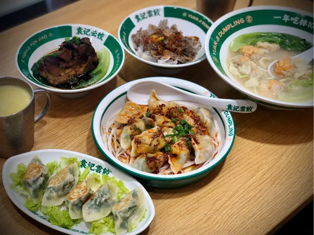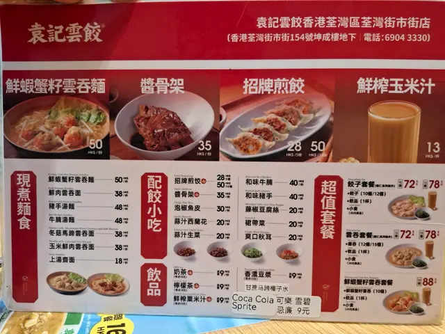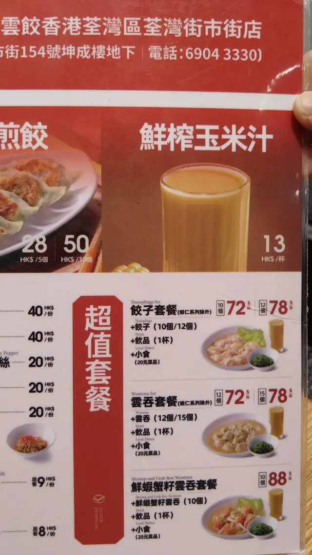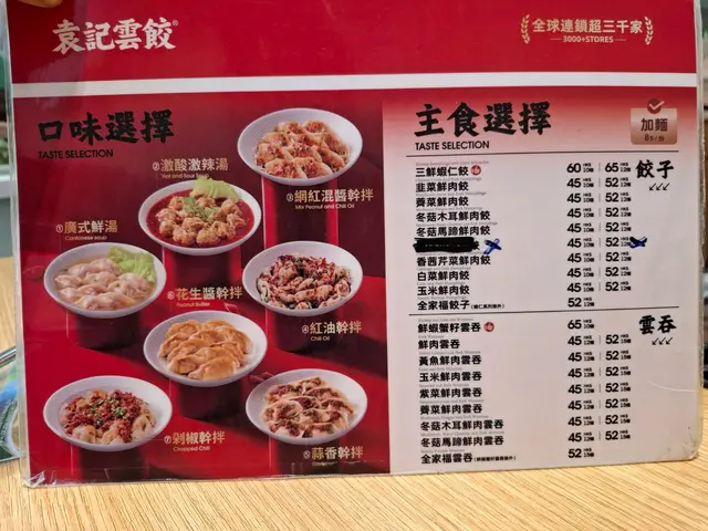 晚上沿荃灣街市街行,絕大部份商店已收舖,條街烏燈黑火,行到將近熊貓酒店我街口,才見到有燈光,<袁記雲餃> 及隔離間麵店仍未收舖!走入店子,由於,廚房佔據大約一半,所以,用餐區顯得窄而深,