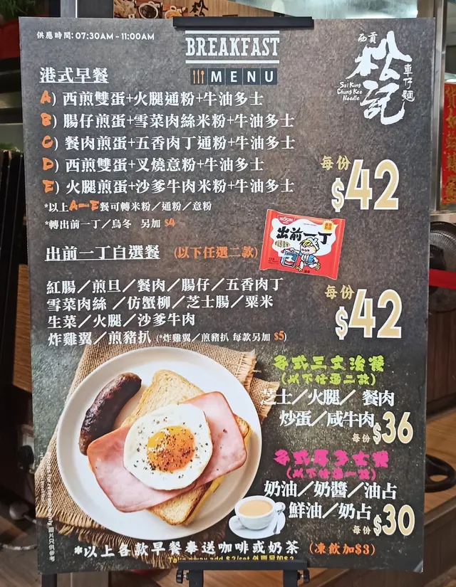 一早入到西貢,做戶外活動前,先食過早餐醫肚叉足電。港式早餐,坊間茶餐廳要有嘅嘢都有得揀。但突然好想食豬扒,所以要咗出前一丁自選餐($42),除咗煎豬扒(另加$5),雙拼芝士腸,餐飲要咗熱奶茶。熱奶茶好快上枱,茶底味可以,而且都滑,合格以上。大概六七分鐘後,豬扒芝士腸出前一丁上枱。豬扒尚算大塊,厚度適中,煎得幾香口。已預先剪開,方便食用。豬扒味道微微帶甜,肉質普普通通,唔算軟嫩亦唔嚡口。芝士腸有四小條,味道正常。出前一丁煮得不錯,唔會太過淋身,麵仲帶有少少咬口。…查看更多