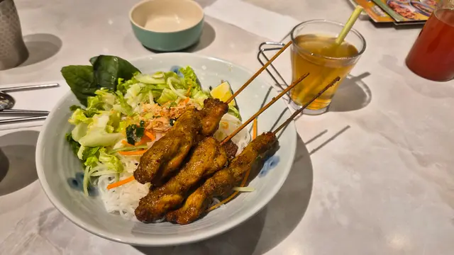 餐廳:西貢街頭越南牛肉粉地點:灣仔克街菜式:越南菜餐牌:茶市套餐有傳統撈檬,湯粉,法包,米飯,選擇都唔少。另加一。可以用優惠價錢加小食。跟餐包基本熱凍飲品,好多選擇。亦有特飲升級優惠。生牛肉牛腩片湯粉 $62 另加一生牛肉牛腩片湯粉大大碗,生牛肉兩大片,生住上枱,呈粉紅色,食落非常粉嫩,唔會太薄,好有牛味。牛腩有5件,半肥瘦,真係超淋超好食!湯粉可選河粉,檬粉或者金邊粉。我選左河粉,係幼身兼非常滑溜,其他配料有洋蔥圈,蔥花,同芽菜等,個湯味道都唔錯。質素係幾好。另配青檸同辣椒比你自己調味。可以用優惠價錢加小食。蒜蓉牛油雞翼 加$28 另加一蒜蓉牛油雞翼一客兩件,炸得脆皮而肉嫩,牛油味適中,如果蒜蓉味濃d就更好。伴有酸醃紅白蘿蔔絲,沙律菜同椰菜絲沙律解膩。跟餐包基本熱凍飲品,好多選擇。亦有特飲升級優惠。薄荷青檸梳打有好多薄荷葉,我叫左走甜,味道酸酸地,夠解渴又健康。總括而言,今餐食物都唔錯,特別鍾意生牛肉牛腩片湯粉,價錢都唔算貴。餐廳環境光猛乾净,座位舒服。…查看更多