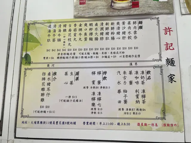上星期摸門釘,不甘心,今日再去呢間位於大埔舊墟既許記麵家,想一試佢地既招牌花雕醉雞。店舖小小,得十零個座位,坐低望下個餐牌,有牛腩有豬什食,但我想試既就係佢地個花雕醉雞,咁一於點個花雕醉雞湯粗啦!不一會就上餐,醉雞既份量係一隻雞髀,再加一碗粗麵,粗麵爽口彈牙,全無一點兒枧水味,加d紅醋落碗麵度一齊食,美味可口。花雕醉雞味道一流,有點幽幽既花雕味,恰到好處,冇苦味,一試令人回味無窮。[米饭]口味:🥚🥚🥚🥚🥚[薄荷]环境:🥚🥚🥚[服务铃]服务:🥚🥚🥚🥚[糖果]性价比:🥚🥚🥚…查看更多