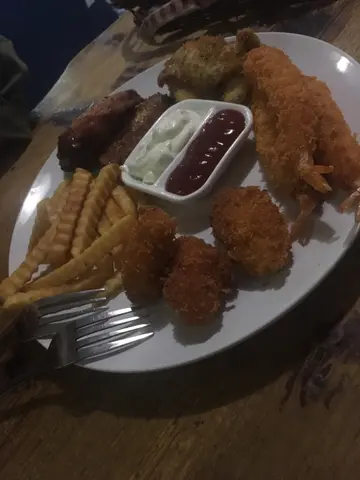 而朋友就叫咗個小食拼盤,有雞翼,炸蠔,炸魚柳,薯條等等。食落外脆內軟,好明顯係啱啱炸起㗎啦,而且蠔同魚都好新鮮,點埋個沙律醬簡直一百分呀。