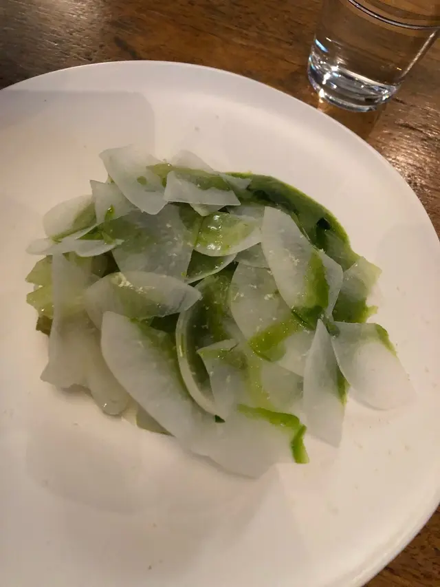 另一款沙律是魷魚刺身($98),它上面放置了一片片薄片的白蘿蔔,將秋葵打汁,一夾見到一粒粒的日向夏蜜柑及一條條白色的魷魚刺身,魷魚刺身非常鮮爽,加上清甜的白蘿蔔片真是絕配,更帶了魷魚的鮮味,蘸上加入了日向夏及秋葵汁醬,感覺好refreshing,非常令人有驚喜又美味,估晤到洋日fusion 的組合沙律都可以做到那麼有水準的效果。