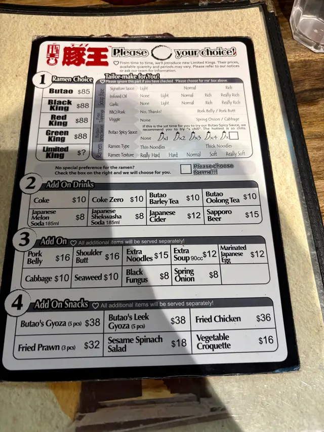 Butao Ramen is located in the more busy area of Central. You can pick from different soup bases and decide what add ons you want. We took „black king“, which is a black garlic base. The black garlic broth was good and strong. We wished they would have added a bit more pork as they were only two slices each in our bowl. The interior is woody and authentic. Only Japanese speaking staff would be missed to make you feel you are in Japan.The prices are a bit higher than elsewhere with 88$ base for the ramen without pod add ons. 10 years earlier it was around 60$. The drinks are additional 8-15$ each if you order the ramen. The price/value could be better.…查看更多