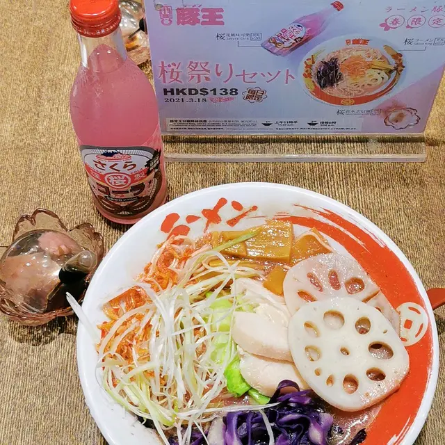 好似去了日本食拉麵呢?櫻花拉麵水準真不錯😋😋能親身看到日本切繪藝術家大橋忍紙雕作品踏入3月的日本櫻花季節,我雖然未能夠乘搭飛機去日本看櫻花,適逢豚王踏入10周年記念,舉辧了「豚王10周年記念櫻祭-SOUL BLOSSOMING」,更遠道邀請日本著名切繪藝術家大橋忍以全人手雕刻製作的紙雕作品,日本少女和櫻花、燕子的構圖好美麗。這個櫻祭定食$138,豚王職人以雞清湯、櫻花蝦粉、紅菜頭和新鮮忌廉,製作出如此鮮甜的豚王桜ラーメン(櫻花拉麵)湯底,麵質煙韌,主角的雞胸肉是好嫩滑又不用多咀嚼,我把整個粉紅湯都喝掉了😋。加上清新配菜有濃郁的櫻花蝦及好爽脆的蓮藕、紫椰菜等,零舍醒胃!套餐包括櫻花風味可樂一支,櫻花可樂成分真的有櫻花精萃,少少酸令人好開胃🙊,好飲過普通版波子汽水。甜品有我最喜愛的櫻花水玄信餅🌸🍮,好滑溜又晶瑩剔透,既然我看不見真櫻花,我要真正「嚐櫻」,把2朵冰涼的櫻花吃下,😆感覺是好甜蜜的滋味。「櫻祭別注版切繪水瓶」換購方法:我也想把日本切繪藝術家大橋忍紙雕作品帶回屋企欣賞,作品圖案分別印製在瓶身上,每次喝水都充滿了春日🌸🌸櫻花氣息。由即日至5月10日內,到豚王任何分店淨額惠顧滿港幣$300,即可免費獲得水瓶一個或惠顧滿$150,另加$35去換購。除了堂食都可以把美味的拉麵帶回家,可選購櫻祭限定版豚王一杯$68,足夠一人份量,內有可加熱的湯料和食材包,豬骨湯底好濃郁,豚肉又好大塊,好值得一試😋。…查看更多