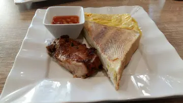 此店部分侍應有點熟口熟面,應該為上一手餐廳員工。開張已有一段日子,今早決定和太太一試早餐。我們同樣叫了雞扒早餐,除雞扒外還有炒蛋,牛油多士,茄汁豆和煙肉(上枱時遺漏了煙肉,最後補回)。😂牛油多士似預先烘好,麵包不熱致牛油不溶,咬落很稔,一般。雞扒煎得恰好,炒蛋夠嫩滑,不錯,而煙肉只是一般。咖啡及奶茶味太淡,一般。整體上算過得去,晚餐未吃過,可能稍後試試。