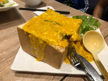 其實呢間餐廳都開左段時間一直都想試下,但係又覺得佢價錢set得有d貴所以一直都未去幫襯過有一次同老婆未諗到食乜,又岩岩經過間餐廳見佢8:30後有折喎,於是就入去試下啦~好多野食都好想試最終點左2樣野炒貴刁 + 軟殼蟹咖哩包先講炒貴刁一睇個賣相就知不得了啦竟然咁有心機整個蛋膜包住個貴刁而且面頭果隻蝦一D都唔欺場呀味道好好食,唔會太油膩!讚跟住到呢個軟殼蟹咖哩包我一見到真係嘩左出聲個賣相真係好吸引個包基本上已經索左好多咖哩汁軟殼蟹又炸得岩岩好而且真係唔細個我諗3,4個人share都得2個人食就真係飽左d淨係食呢2樣野已經覺得好好食遲d真係要試下其他野先~